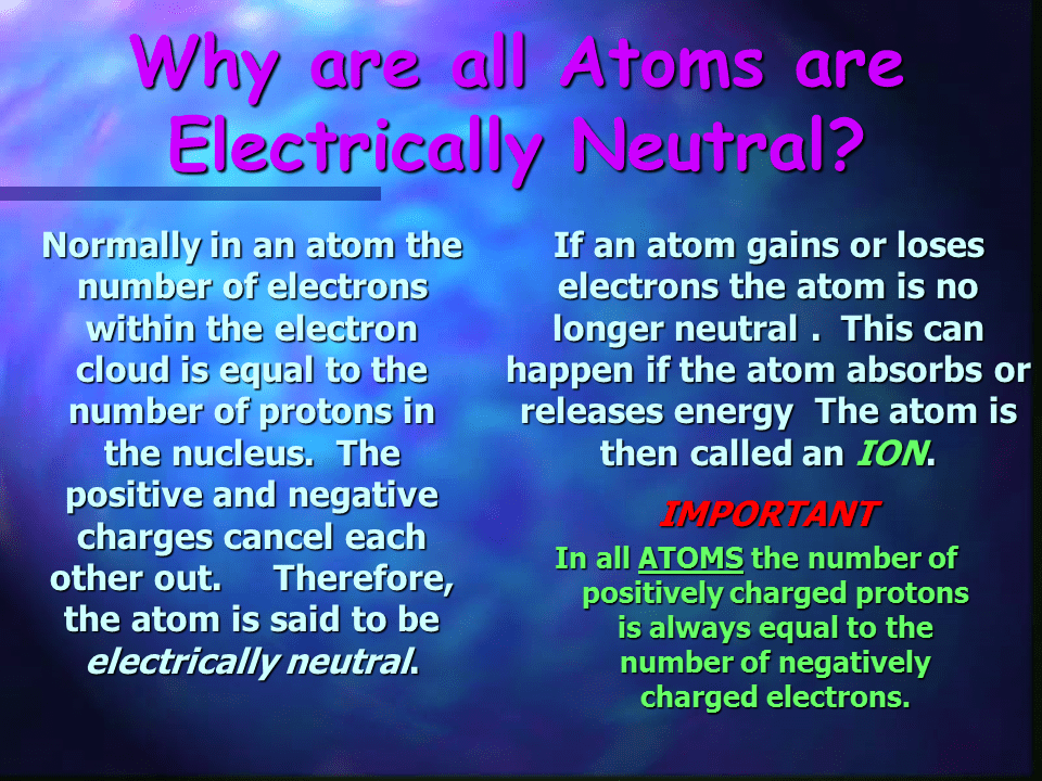 Making the center of the atom stable. Atoms are usually neutral because the number of electrons are equal to the number of proton. As long as the numbers of electron and protons are the same, the charges will balance. 03/08/2019 · overall, the atom is uncharged (neutral).